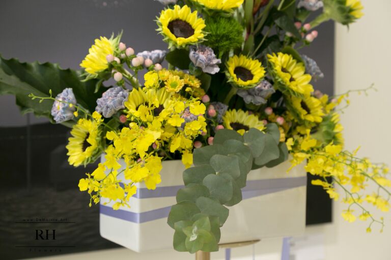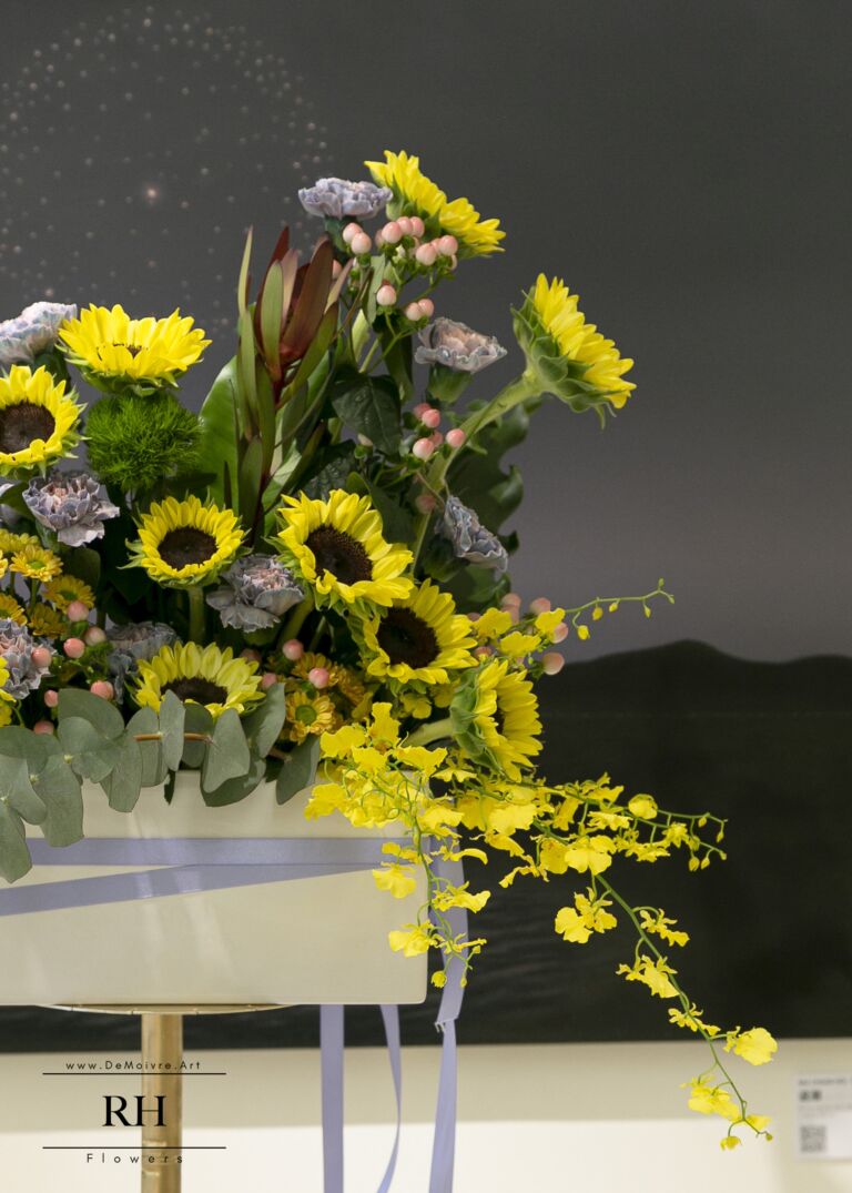我們使用亮色作為主要配色,配搭其他花材設計,但可以儘配合你們的要求變成不同顏色,例如白色、綠色、黃色、粉色等。